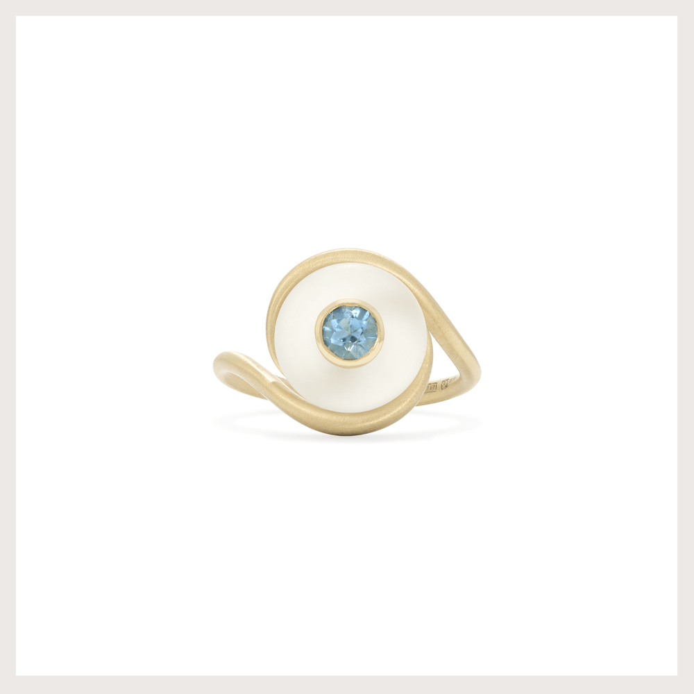 anel ouro com quartzo branco leitoso e topázio azul